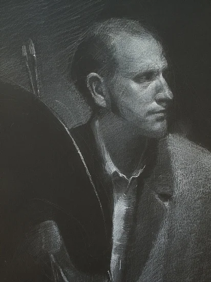 I love to draw on black paper with white charcoal. I use only sight-size method of measuring, which fits how I see and comes to me naturally. This method has advantage over other drawing techniques such as comparative and relational measuring techniques, because it's easy to see values on the subject.